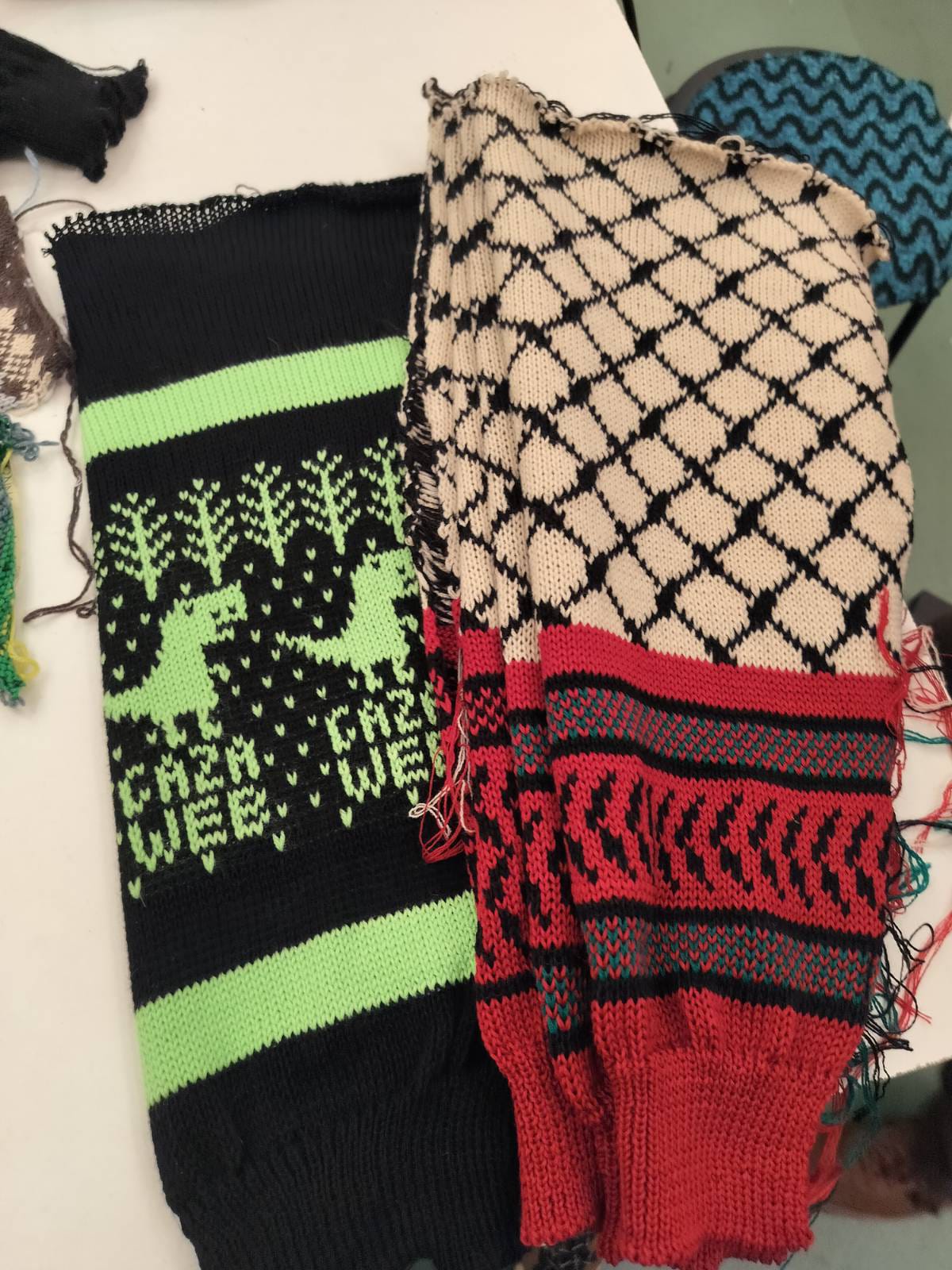 Insieme a vari video e foto, abbiamo esposto anche alcune delle opere collettive tessili (stendardi, arazzi, bandiere, opere di maglieria) più belle e significative realizzate in questi anni. E la mitica cucicletta, essere ibrido metà bicicletta metà macchina da cucire.